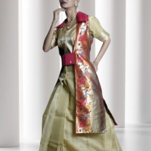 Crafted from rich Tissue Benarasi and elegant Semi Katan Silk, this set offers a luxurious drape and festive shimmer, ideal for puja days and evening gatherings.